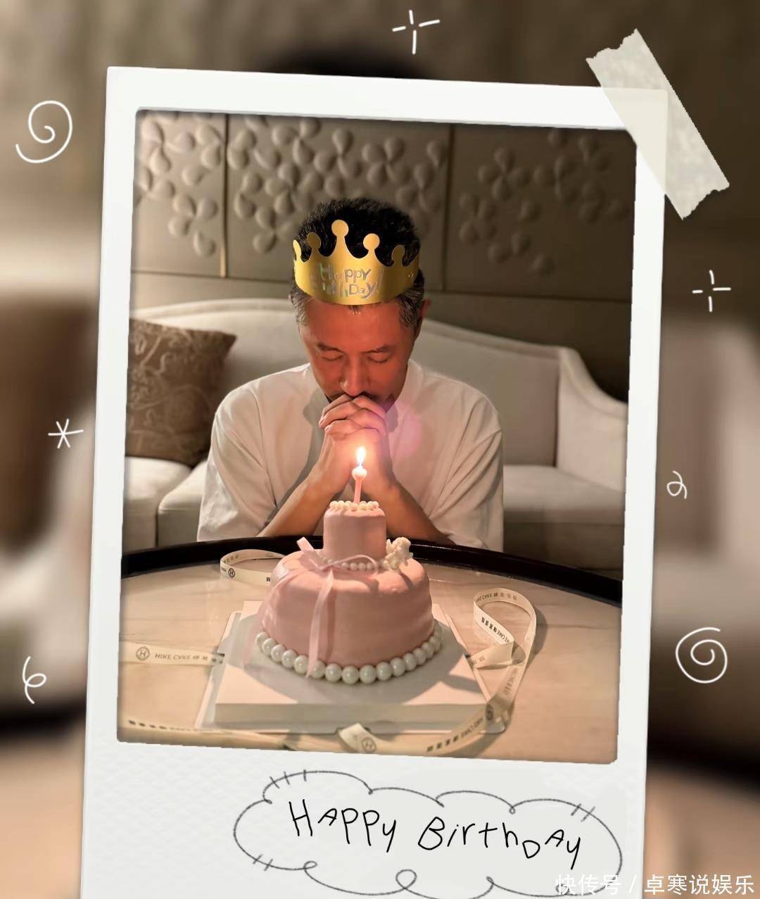 生日照片中,一个装饰着粉色蝴蝶结和珍珠的蛋糕格外引人注目。这明显不符合直男审美,反倒是透露出对家中两位“小公主”的宠爱。